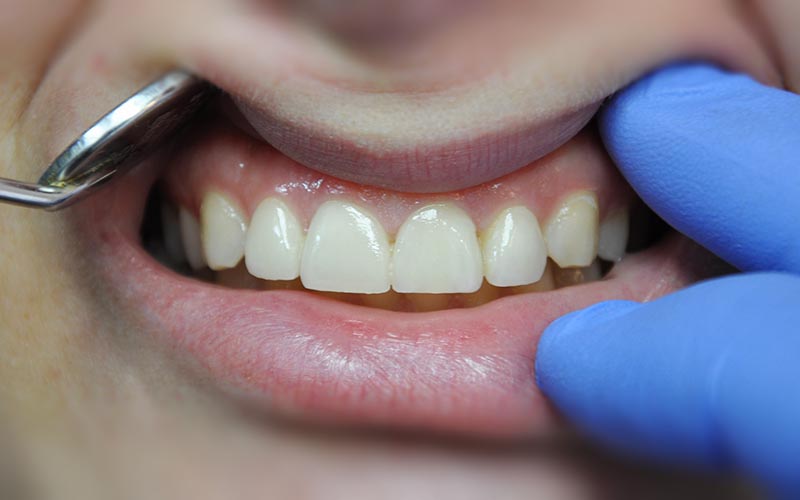 При осмотре (фото №2) обнаружены на передних зубах многочисленные сколы эмали, старые пломбы, которые были заменены на новые реставрации.